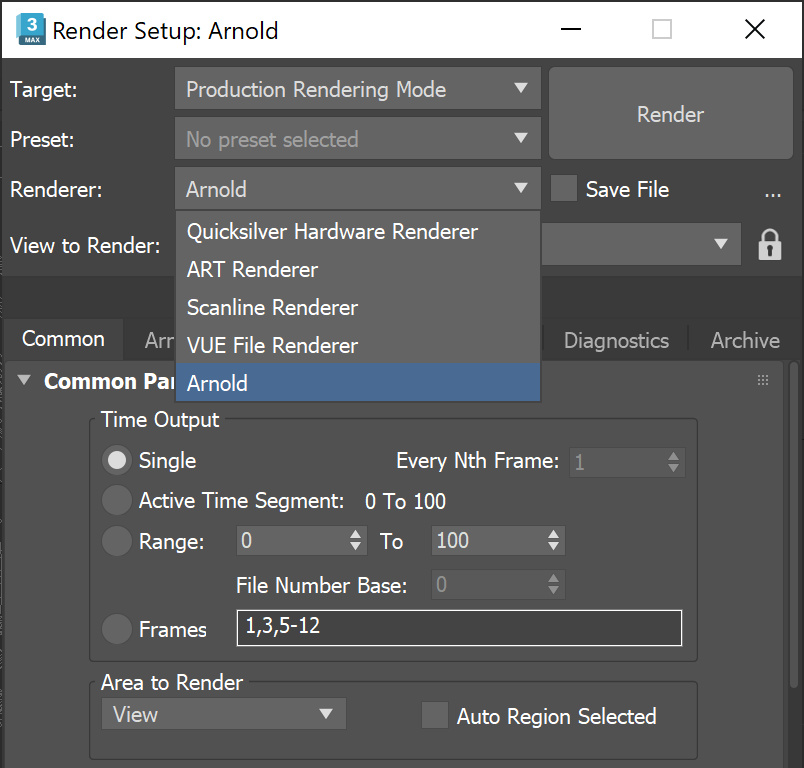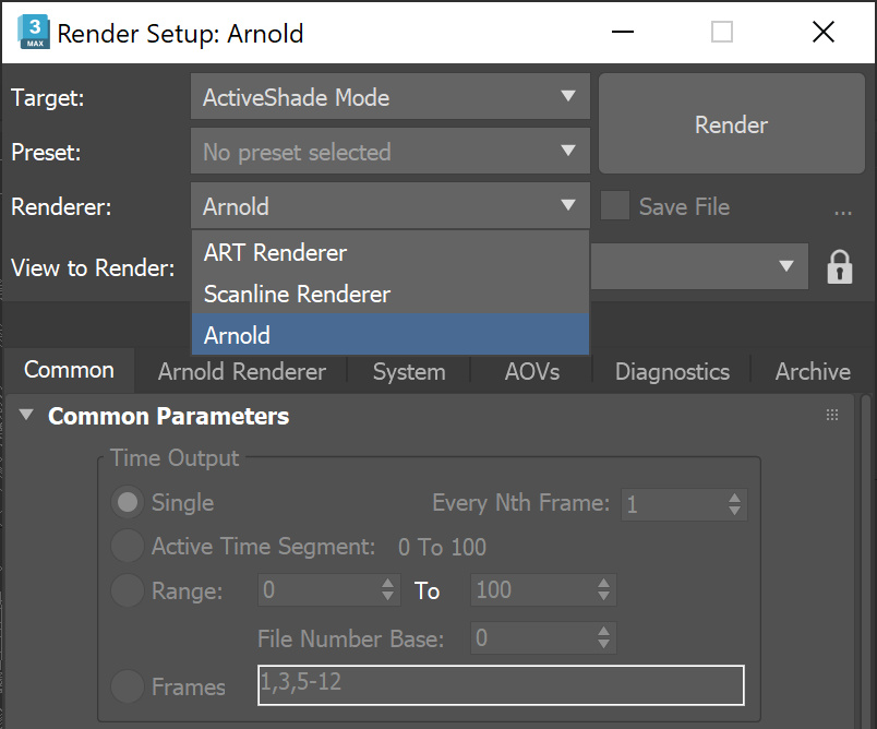 在窗口中使用“ 渲染器”下拉列表在Scanline和ART之间切换: