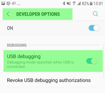 在Android设备上,转到设置>开发人员选项并启用USB调试。