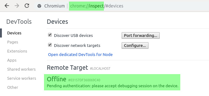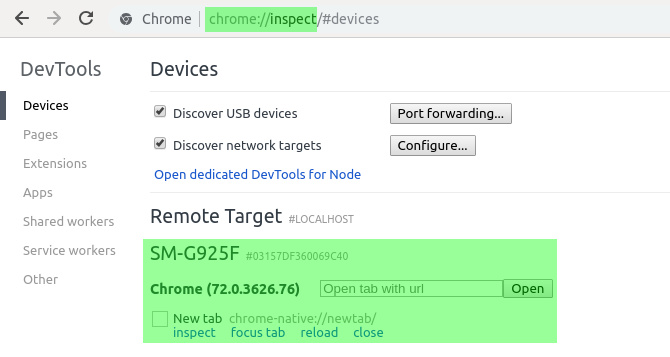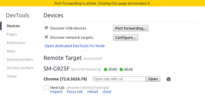 因此,您应该可以通过导航到localhost:8668直接从移动设备的浏览器启动App Manager 。此外,您可以通过单击chrome:// inspect页面上的inspect链接来查看移动浏览器控制台的输出。