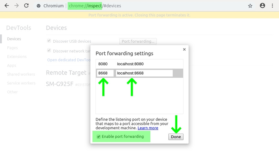 单击chrome:// inspect页面上的Port forwarding按钮。在显示的窗口中:在Port字段中,键入8668,在IP地址和端口字段中,键入localhost:8668。单击“ 启用端口转发”并使用“完成”按钮关闭窗口。