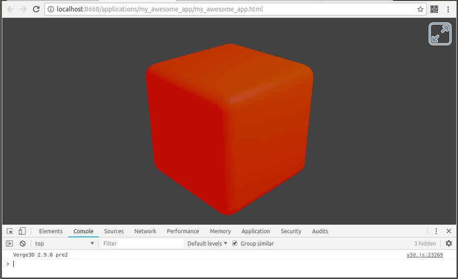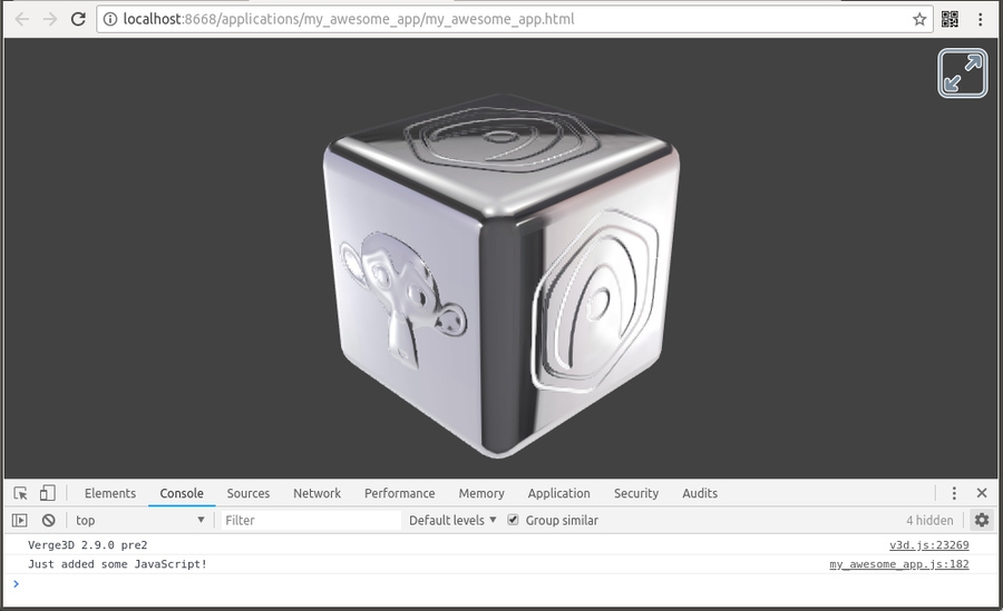 假设您使用App Manager(使用默认配置选项)创建了应用程序,并将其命名为my_awesome_app。转到verge3d / applications文件夹,然后转到my_awesome_app文件夹,并使用您喜欢的文本编辑器打开JavaScript文件my_awesome_app.js。