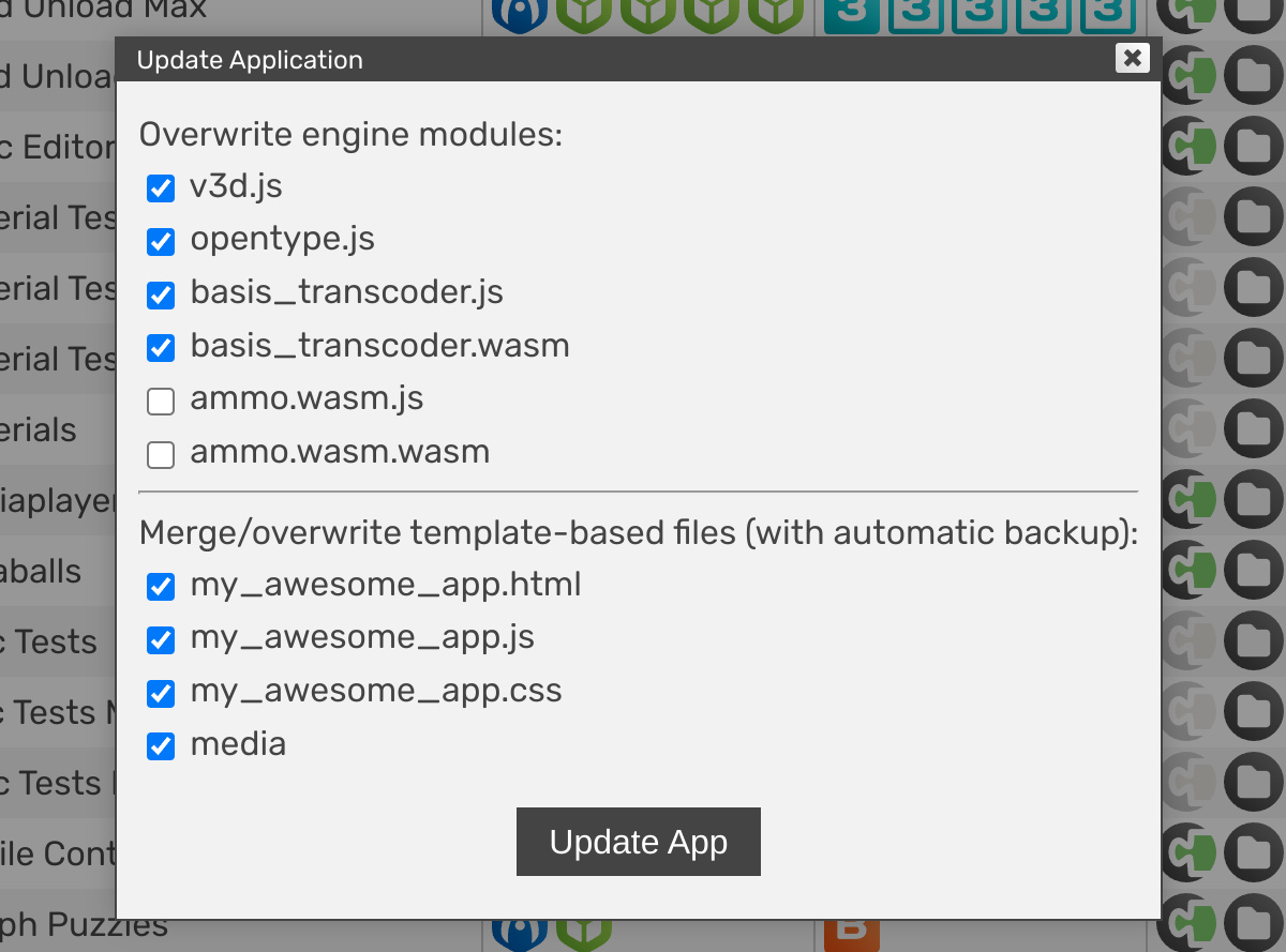 Under the hood, this operation overwrites the engine modules by the files from verge3d/build folder, namely, Verge3D runtime v3d.js and optional compatibility modules ie_compat.js (enabled by IE 11 checkbox) and webxr-polyfill.js (enabled by Legacy VR checkbox in the app creation panel). If you choose so, this operation will also overwrite the selected HTML/CSS/JavaScript files and the icons folder media by the files from verge3d/manager/app/Standard folder.