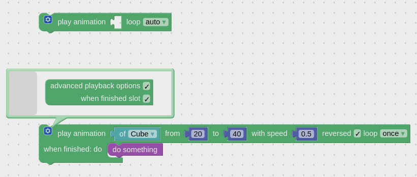 Animation clips are created for relevant model parts as usual. Skinning, whole-object, morph-target and material animation can be used to produce various effects.