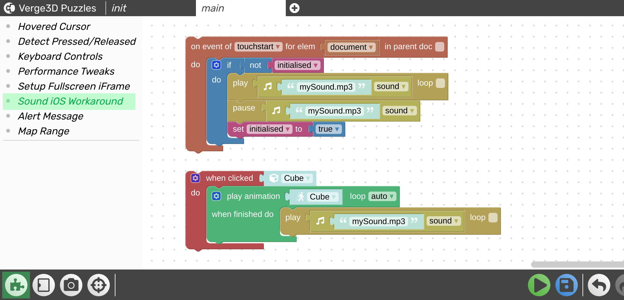 The above setup is available from the Puzzle Library under the name Sound iOS Workaround.