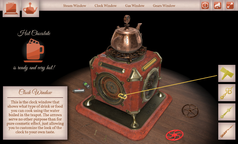An interactive scenario is created using Puzzles for triggering animations upon clicks, outlining objects upon hovering, positioning model parts, logic checks, etc.