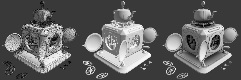 在我们的团队中,使用以下建模流程。首先,创建高精度的模型。在下一阶段,通过简单地移除suburf修改器或拓扑方式(retopology)获得低面到中等面模型。模型建议不超过10万三角面片。