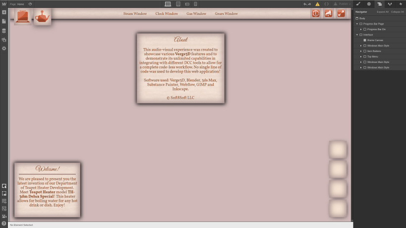 In our code-less workflow the HTML-based interface is built using external web design software. Any WYSIWYG editor capable of exporting HTML/CSS/JS files will work – for example, Google Web Designer (free, cross-platform) or Webflow (paid, cloud-based). You can, of course, build the HTML interface manually with code or using some other tools instead.