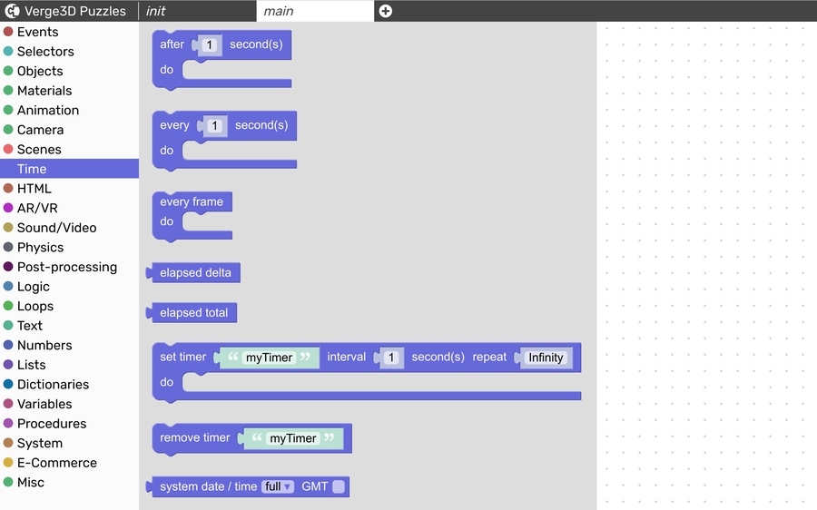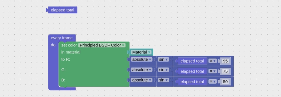 Outputs the amount of time (in seconds) passed from the application start. Can be used with the "every frame" puzzle to implement procedural animation and various visual effects.